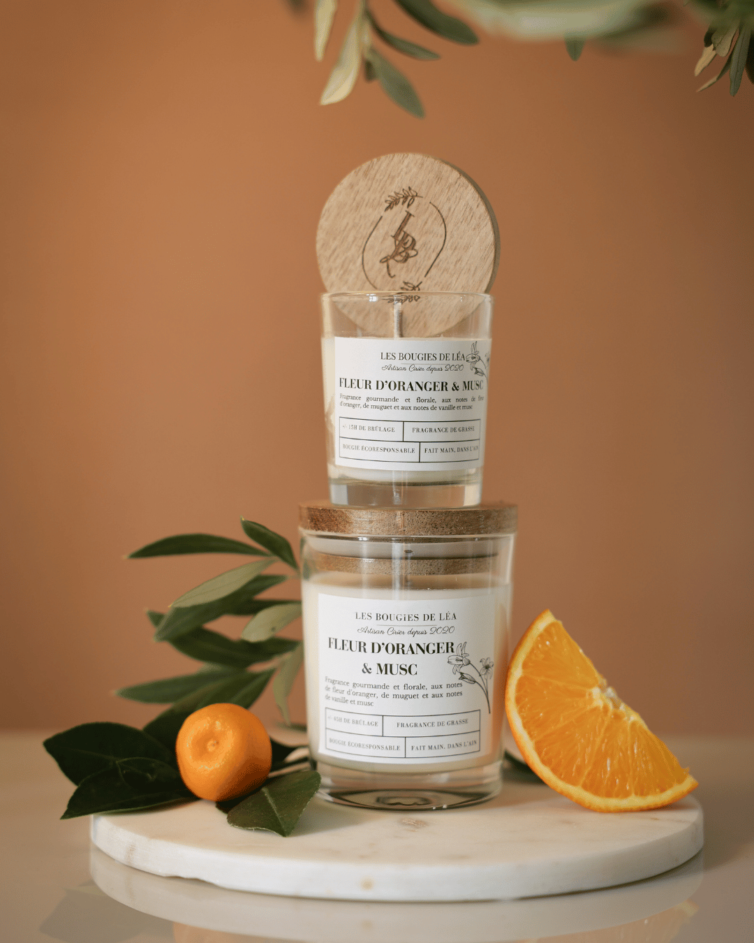 Bougies naturelles parfumées Les Bougies de Léa réalisées en cire de soja sans OGM et coulées dans des bocaux recyclables.