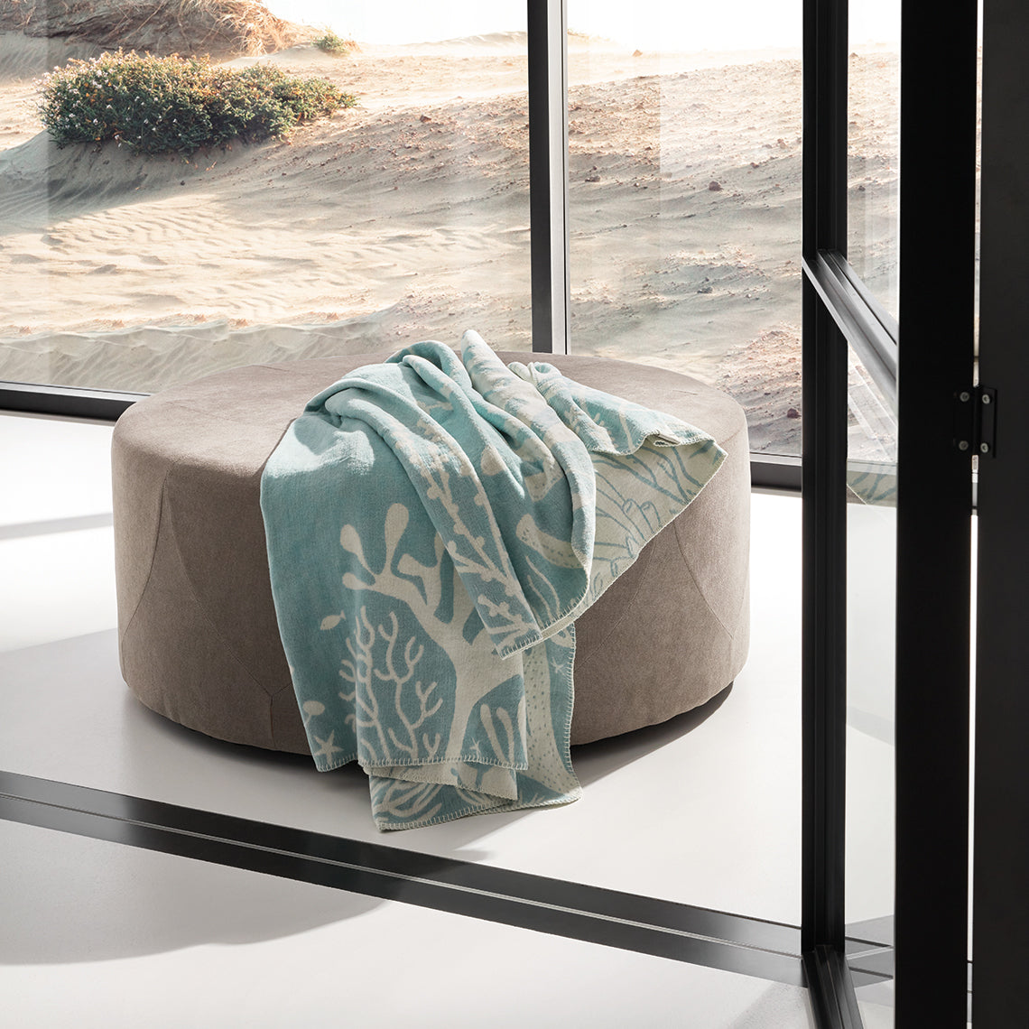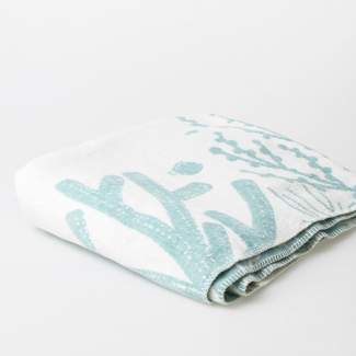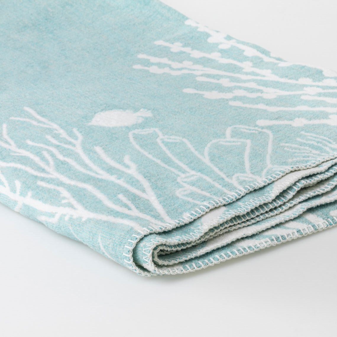 Très joli plaid tout doux bleu et blanc avec décor "sous la mer".